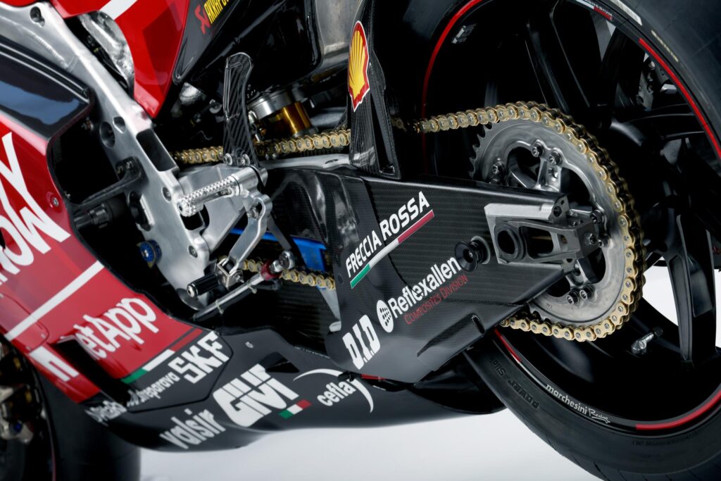 •    Ducati GP19 iz leta 2019 je opremljen z vodno hlajenim motorjem V4 DOHC s prostornino 1000 cm3 in seamless menjalnikom v okviru Evo z dvojnim nosilcem iz aluminijeve zlitine.